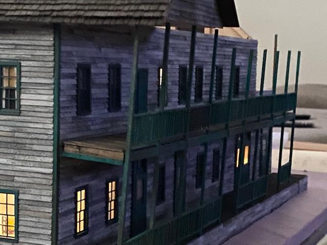 • gee fellas, today is a red letter day for norton's fish camp. i finally got my order from evans design, so i added about 20" wire to the leads from the battery clip, soldered in the light for the veranda, and all the building lighting is finished, which means; i can glue all the walls together and focus on the roofs. because i'm not a mathemetician, or a carpenter (though i have build several houses helping a buddy/carpenter), i need to be really careful here. i need to tack the gable roof in ITS FINAL RESTING PLACE in order to get the length of the ridge beam, the angle of the cut on the ridge beam, and the angle of the main roof panels in the valleys (front and back). sheesh, when i type it all out it seems like i'll never finish it.