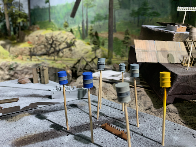 A progression on a barrel here using a chipping technique. Started with a yellow barrel and chipped it with a light yellow. Touch up the light yellow chips with dark rust. Add some enamel rust, a label (with an unintended wrinkle), a light layer of dust. And finally some rust streaks and a light touch of oil stain on top. It's scary getting in this close as all of the imperfections show up very clearly.