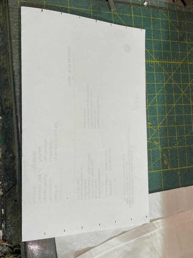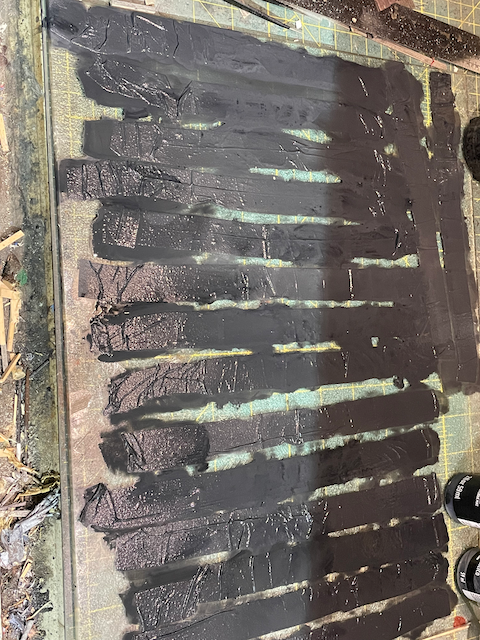 This thread could also be called "Tarpaper a'la Robert". He got on me during my O'Neills build about my tarpaper. Said I should use tissue instead of the material I was using. He says that he paints his by the sheet and hangs to dry. Surely he build a scale clothesline with clothespins for this task. I found that pre-cutting the strips worked better for me. What follows are the steps I use to make the strips.