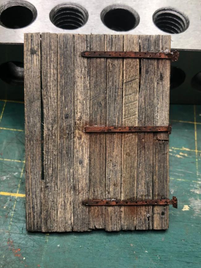 • Thanks Joel,always nice to hear from you. Most of the detail parts are painted now. So I thought it was time to start adding a fews to the walls. The hinges were added to the big door. Weathered with chalk and alcohol glued in place and then some chalk powder was brushed on the wood to simulate rust washing down from the hinges. IMG_1534resized