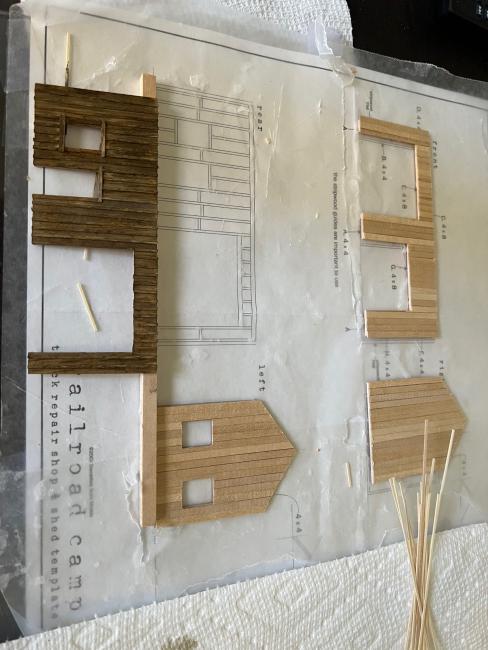 Thought I'd make a contribution and show work in progress. Assembling framing over wax paper on templates isn't too difficult, nor is the first layer of siding. I did find the work on battens to be challenging due to the size and needing to align then properly, while applying glue. I had some problems with window frames breaking. This may in part be due to the fragile size though most likely the material is somewhat brittle as the kit was made several years ago. The kit was complete when I bought it from a hobby shop a few years back but don't know how long ago it was originally purchased. For weathering I used a mix of weathering and alcohol and am reasonably pleased with the result. I'm planning to continue with this building scene (side shed, roof and details) before moving on to the Boiler and Welding Shop.
