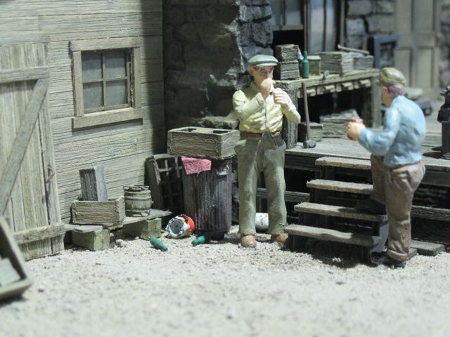 I Have really enjoyed watching this build and the color, texture and weathering is very subtle and natural looking. You have a very good eye! That being said I hope you take the following comments as constructive criticism and not thoughtless nit picking. First I think the birds detract from the model, not add to it. These are a very difficult detail to do and yours are better than most I've seen but still only detract not add to the scene. These metal castings just never really look,like real birds at least IMHO. The other thing that I don't feel works is the repair. I know modelers want to tell little stories within the total scene but this one doesn't look right to me. In reality someone would have just yanked the broken post out (while temporarily supported like you show) and cut and wedged a new one under the overhang. If I were to do this scene I would use just one old length of board that maybe was slightly warped as the temporary support so the repair guy would no he better get a new post under there ASAP. Again I do think your work is excellent and the castings are very well done. I hope you take these comments as my honest opinion of how I think you could improve this dio.