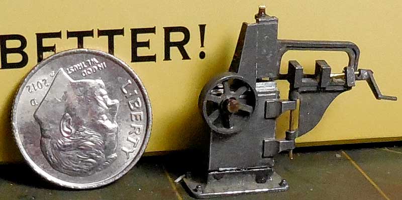 I've started the bents for the water tank - seems straight-forward enough. I wanted the wood to look really wrought hued and gave the boards lots of texture. In the drawing the bents are slightly indented on each side - to get this effect I took a small narrow scrap and taped it to a angle iron to get the indentation. the other difficult thing is getting the second side bracing without tearing the whole thing to bits - I used a couple of scraps to hold the back side up while I did the other side. Then Brett has already used his laser to cut the nut and bolts - just paint and glue. I decided to snap a shot and present this info to help with the assembly - on to the other two