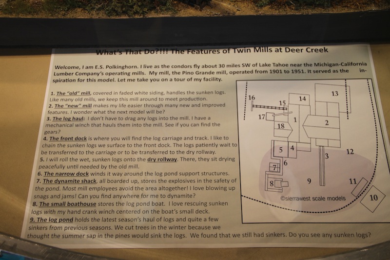 Inside the display case is a brief history of the Pino Grande mill (the inspiration for the Twin Mills) and a numbered diagram pointing out the name and function of each structure on the model.