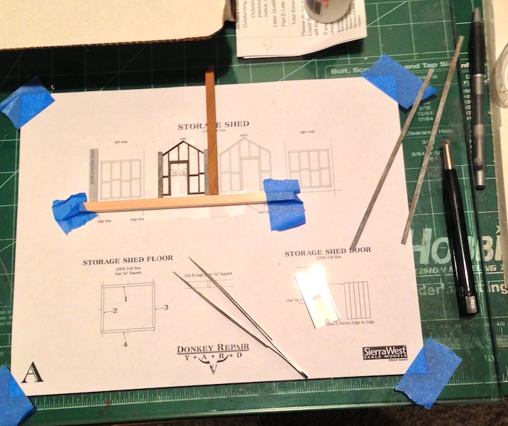 First step in construction of the Storage Shed is to decorate the stripwood for the walls.