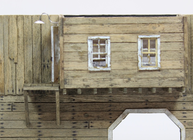 This week I have been working on illumination and by today was ready to bring the four walls together at last. In one last check of the LEDs I was horrified to see that the micros under the large awning and above each of the three doors wick light up the interior of the boards immediately above them. Dimming was no help. Not acceptable . . . . They were epoxied in place so I had to dig them out and destroyed them in the process. In the photo below you can see the new scheme - I used lamp shades and attached them so that the rims are parallel to the ground. The first set of LEDs had been mounted above each door frame and right up against the bottom of the awning. This new solution looks better, illuminates better and is a total fix.