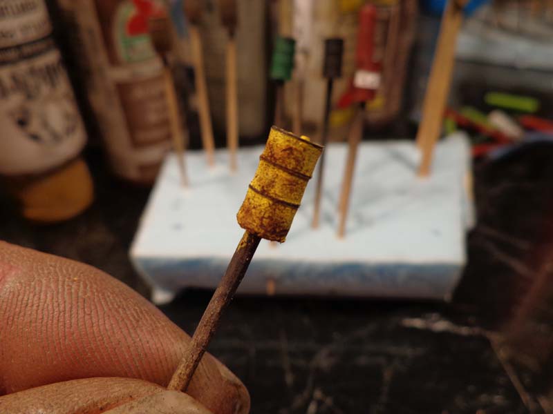 As with the oil drum the toothpick handle makes a simple job of rotating the barrel while carefully painting the bands with the C&A. I complete one band all around before moving to the next.