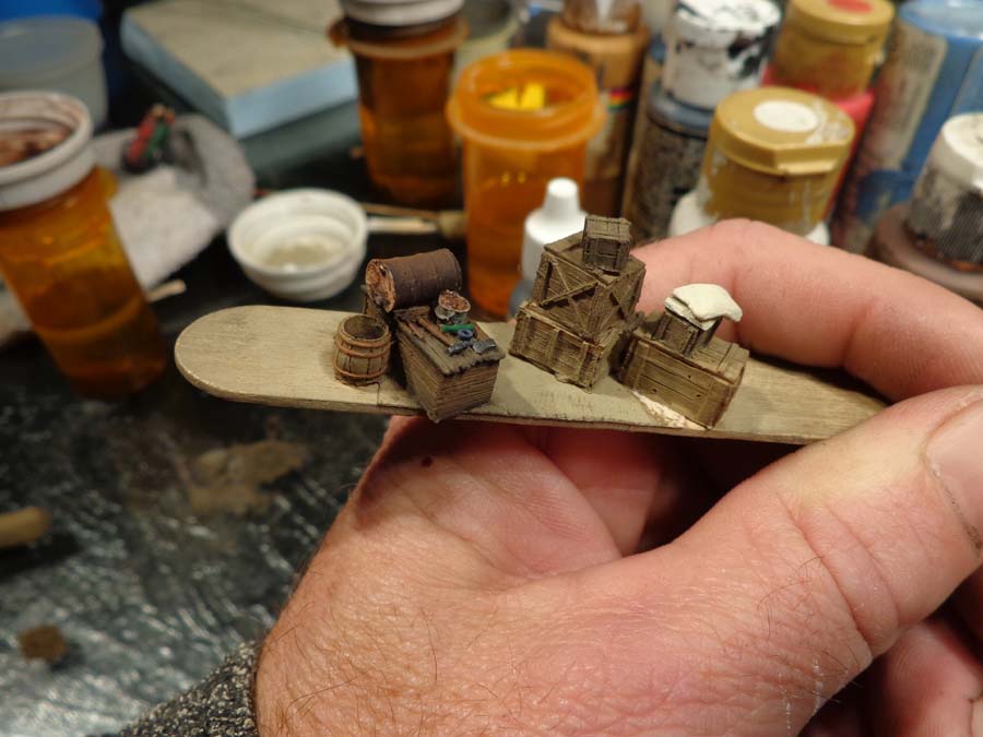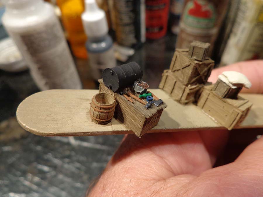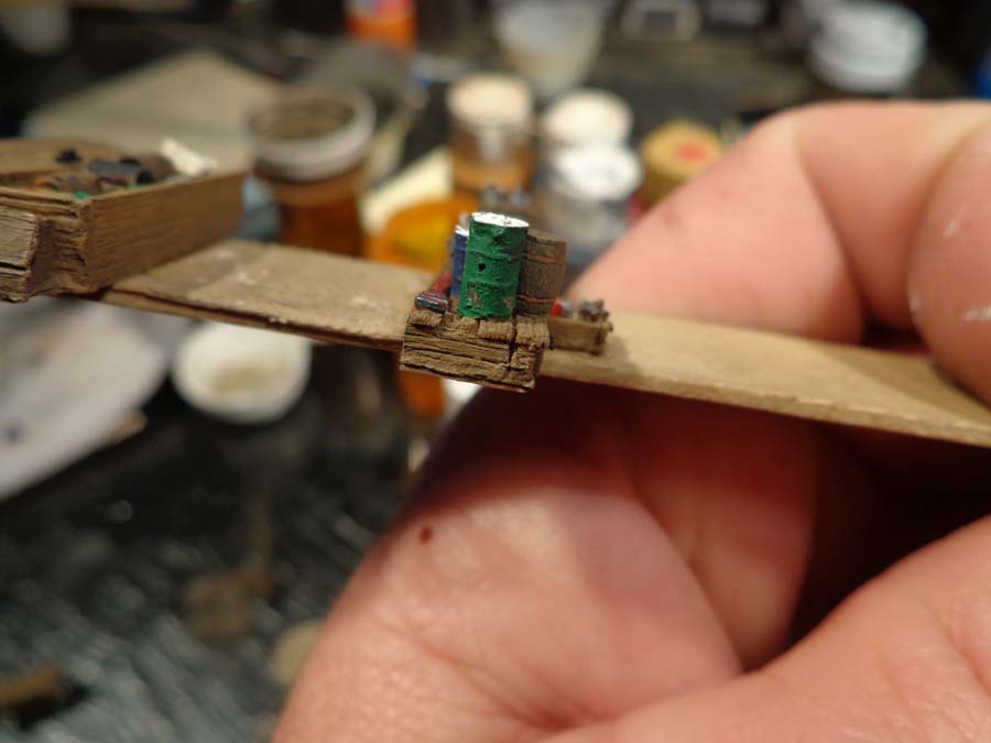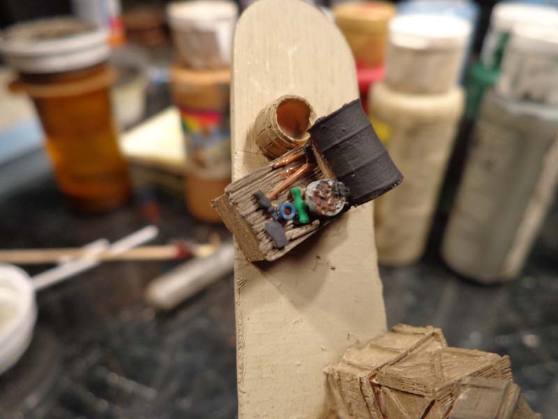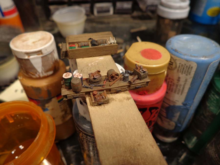 When I had finished painting the barrels I wipped all the paint from the brush and dry brushed again the misc. clutter drawer and bucket for some extra highlights.