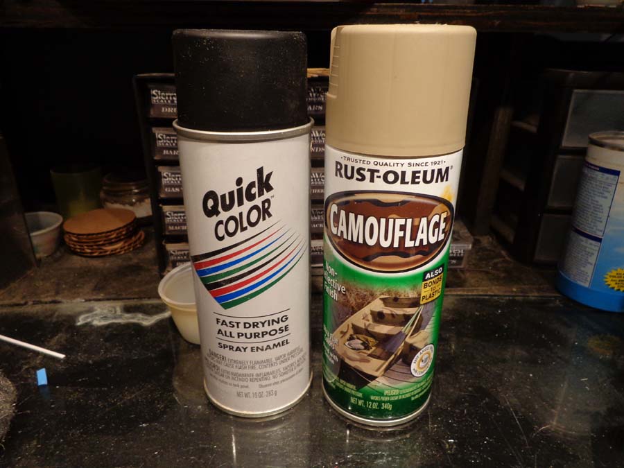 For base coats I prime with rattle can paint. Anything that represents wood I spray with Rustoleum Camoflage "Khaki" a light tan colour almost identical to floquil earth (except in price).
