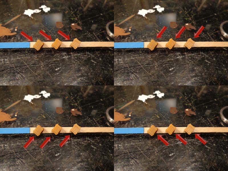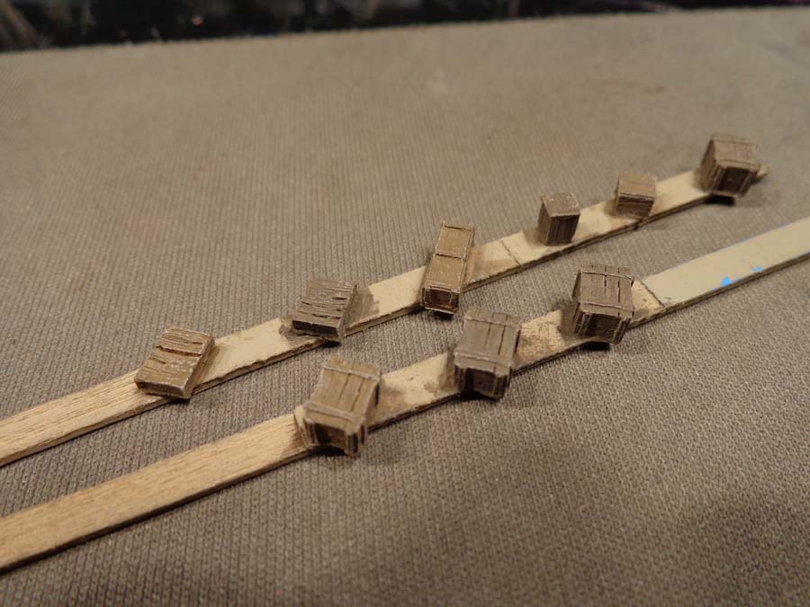 The small crates are attached to coffee stir sticks using carpet tape.