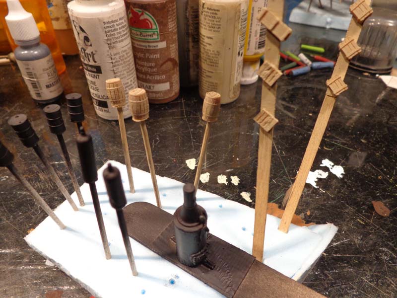 For barrels and drums I like to be able to twist them as I work on them so a hole is drilled in the bottom and a toothpick inserted. Certainly not a new idea and not mine, but, it does work great.
