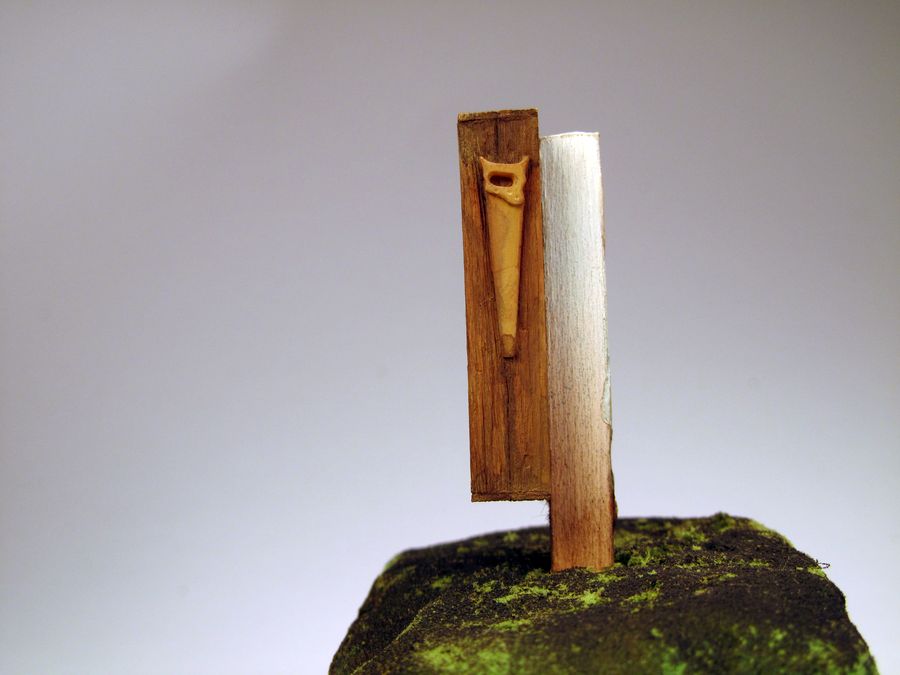 I did the saw blade with a mix of tarnished steel and dark rust. The handle is old wood drybrushed wiith a little flat flesh.