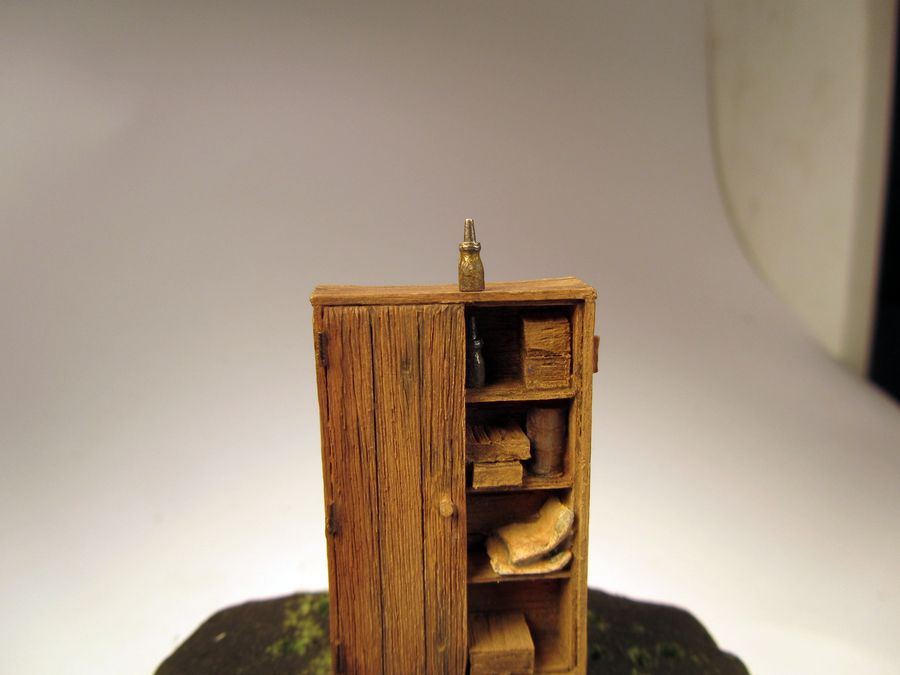 Now it's just a matter of using your A&I to hi-light the spaces between the boards and the board ends. This casting has a very nice grain in the boards so this can be gone over with your fine brush and the A&I. The key is to go over all the details numerous times with very light coats. You can't just flood it on in one pass. If you look at the three boards on the front you can see where I've traced over some of the grain to hilight it. It takes a little patience and you have to use a very fine brush with just the slightest bit of A&I in the tip. Once you get the hang of it it's really easy to do and I think it makes a big difference in detailing these castings. I also used a wash of alcohol and chalk (raw umber 408.5) to color the inside of the cabinet. It doesn't matter if you get this on any details as paint will cover it later. I don't usually do it but I think I'm going to dry brush this cabinet. We'll see out it turns out tomorrow.