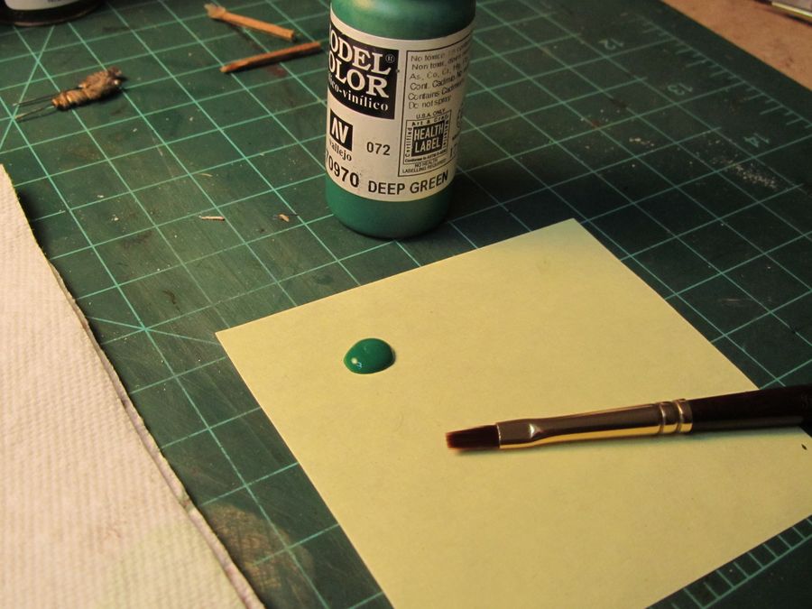You can see the size brush I use and if you look at the green and white on the post-it paper you can see how I draw out the paint so just the tip is loaded. This is a simple but important thing to do so you don't put too heavy a coat of paint on the casting.