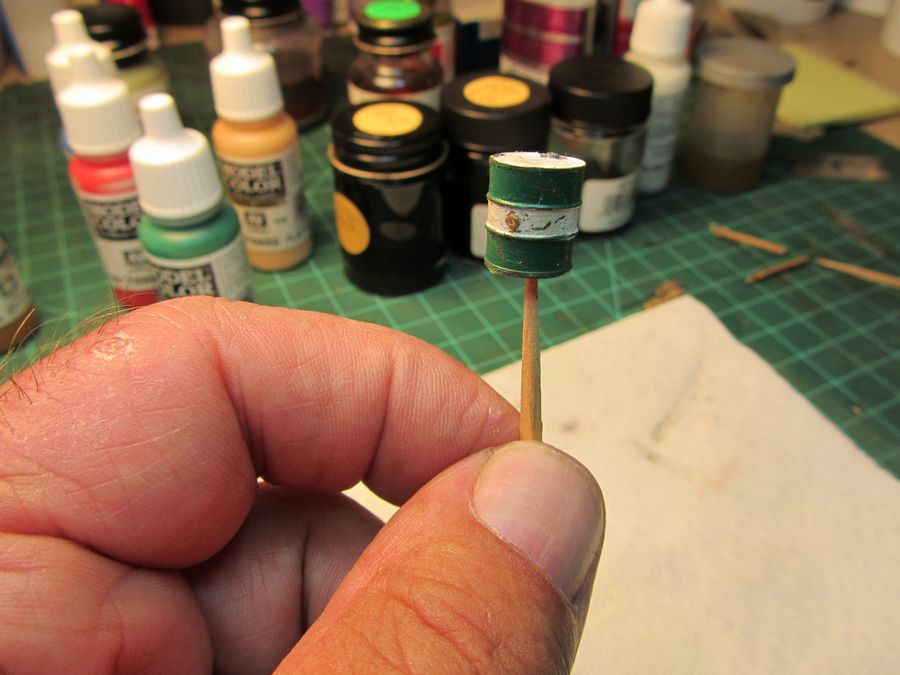 The first one is the basic green and white bands with a white top. I used off white #70820 and deep green #70970 both brushed on full strength. The white gets two coats and the green only needs one. The barrell has been primed with Floquil Roof brown spray. These dried overnite but an hour would be fine as the coat is light and you are going over it with acrylics. I also hit it with some unscented hairspray to act as a resist, so the paint doesn't bond to the primer and can be peeled easier.