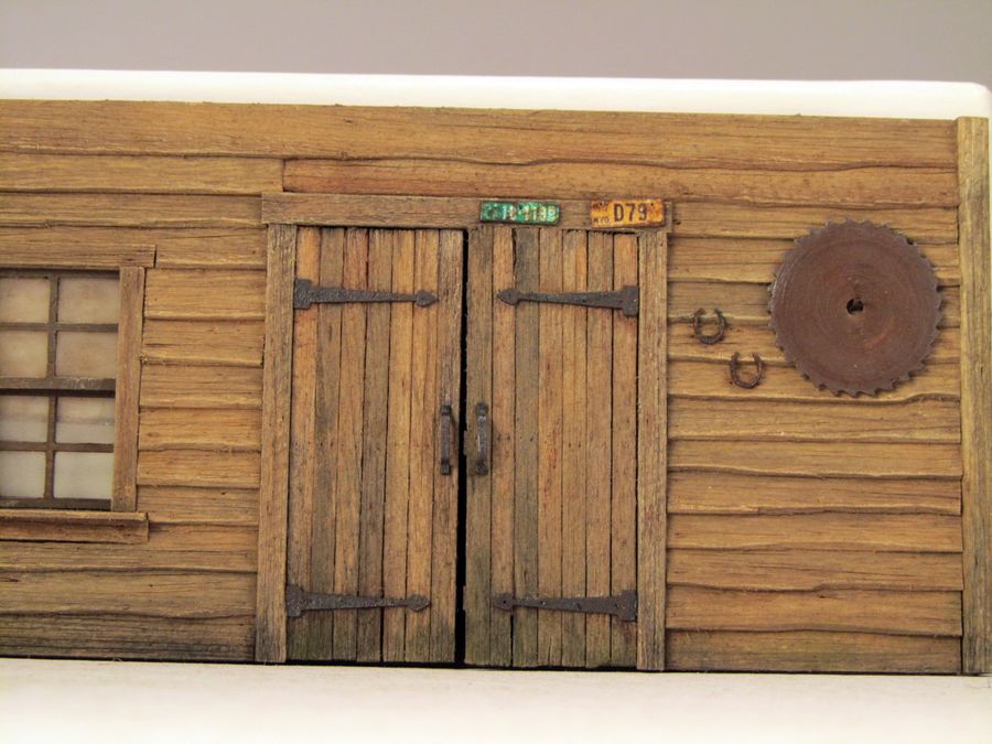 Here are a few pics of the front wall. I used Reaper Master series #09124 Adamantium black to color the hinges. I got this color when I ordered a bunch of the other Reaper colors but had never used it. I thought it was just regular black but after trying it on the hinges I saw how it has a slight metallic quality to it. To my eye it gave the hinges the look of hammered black wrought iron hinges. I went over the hinges with a very very faint, thin wash of Vallejo dark rust. I think they came out really nice and in person they look even better. The sawblade that starts out as laser cut wood was done by pressing the blade on a conical shaped bit chucked in my dremel and painting it as it spins. I use a mix of Reaper tarnished steel and Vallejo dark rust. A really neat trick to get the circular marks on the blade. OM (Kevin)