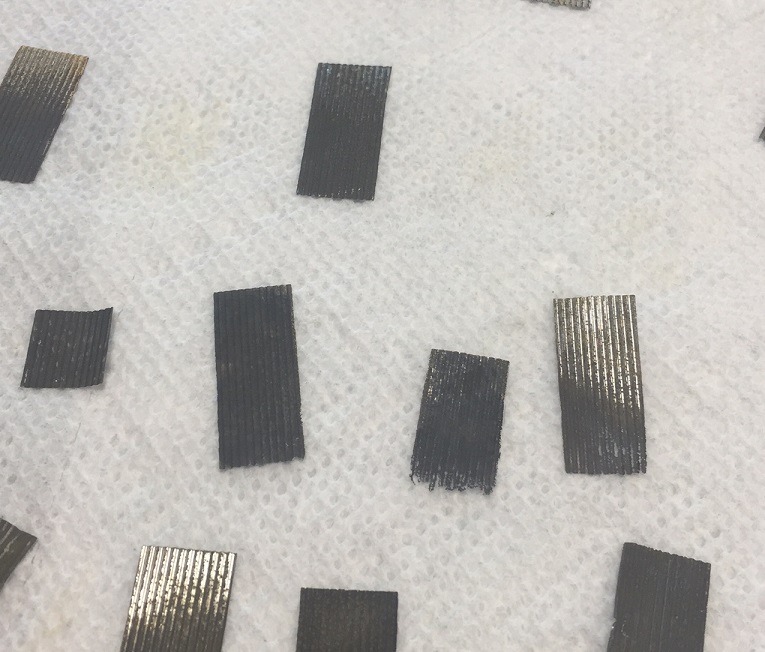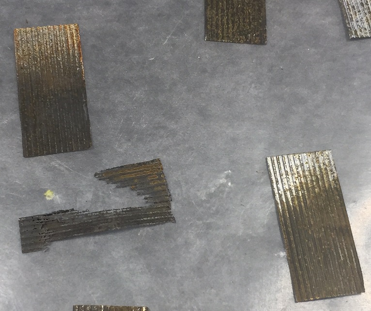 7 - At this point, you have about 5-10 seconds to fish that panel out of the solution and to drop it into the first bowl of water. The longer you leave the panel in the solution as its "sizzling", the more it will turn the panel blacker...to the point where it starts to disintegrate. I let a few of the panels reach the disintegration point which I show in the pictures. Once you've fished a sizzling panel out of the Etchant with your tweezers, continue to hold some of the panels in your tweezers above the bowl of water until the sizzling has stopped...then drop it in the water. By doing this, it will give you a different weathering effect then if you drop a panel in the bowl of water while it is still sizzling.