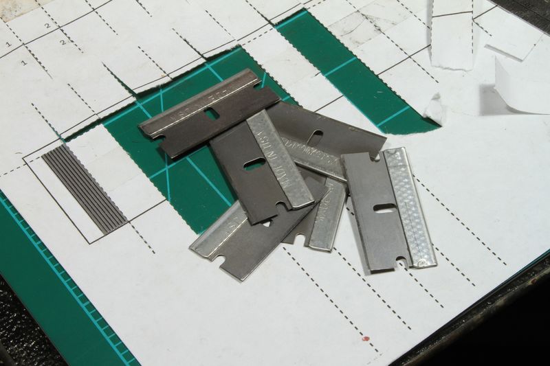 Tape down the pieces of aluminum to the cutting template (I had good luck with blue painter's tape). I took the ten 1" pieces out of the second row starting from the left. Take your time when cutting these. Use fresh blades and change blades often. The moment my blade felt like it was getting dull, I changed it. The aluminum panels chew up a blade in NO time at all. I bet I went through a dozen blades cutting these panels (75 cents worth, I think). Overkill? Maybe. But I love Brett's philosophy on razor blades: "Don't frustrate yourself fighting with dull blades".