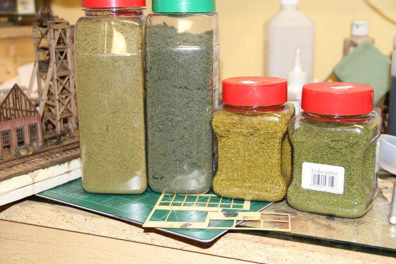 Woodland Scenics coarse turf burnt grass (T1362); Scenic Express Burnt Green coarse (EX813B); SuperLeaf Moss Green (SE6142); Noch Leaf Flake Olive Green.