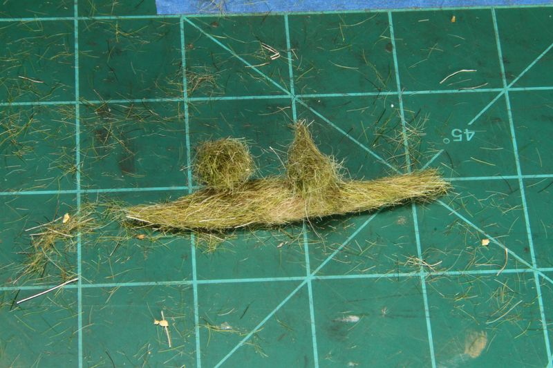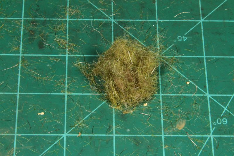 Here's something new that I tried with this build. I can't take full credit for the idea because I saw guy on youtube a few years ago do a form of this. I wish I knew who it was because it's really clever, but I've never been able to find that video since watching it. What he did was took an old light colored Halloween wig and cut it up into tiny pieces. Then, he mixed the pieces in with some static grass and rolled it all together. Then, the "roll" of fibers was pulled apart and dabbed into spray glue. It was kind of a way to apply static grass without having to buy a static grass applicator.