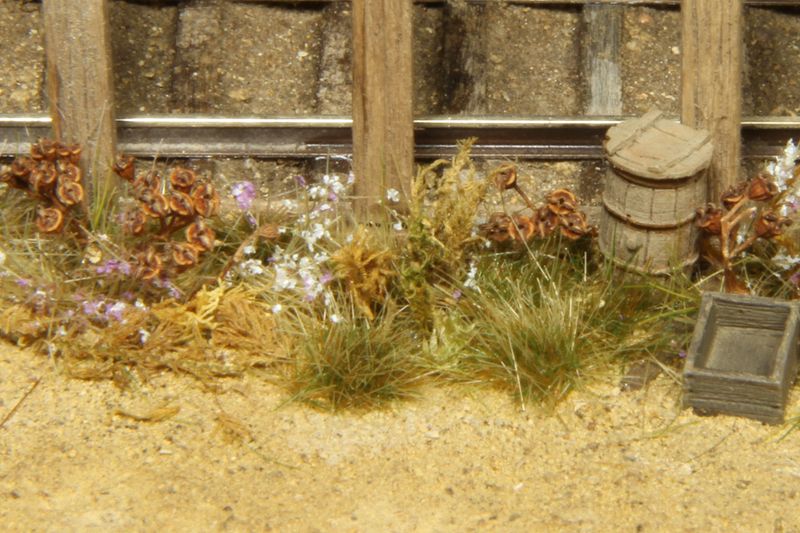 The tiny splashes of color (purple and white) come from those "Short Blossom Tufts". There's also a small thin clump all the way to the left of the picture, but I used a more brownish color. The dark brown "flowers" by the second bent from the left are pieces of sedum. They're a bit out of scale for HO, but I think it works well in the scene because I applied them sparingly.
