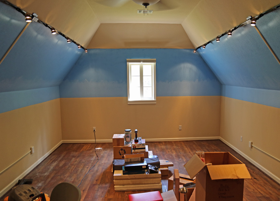 So why the stripe? First, the bench work will be below the bottom blue. I want the benchwork to be higher so folks can really see these fine kits. Second, I really didn't want to paint the ceiling, so I ended the sky at the track lighting. Later I will add clouds as I add structures and the scenery.