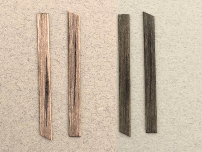 In the next example I utilize my #11 blade and at a very oblique angle cut slivers and chunks of wood from the board (figure 2, left image). This creates sharp angles and edges on the lip of the cut areas, we want to age this...This next step is very important and makes all the difference in a detailed aged board. I take my sanding stick and lightly sand the cuts with the tip of my sanding stick to smooth, blend and age the cuts