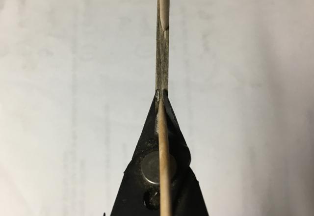 After a few minutes to let the glue dry I take a rather dull pair of old nippers, as I want the wood to smoosh a little rather than a nice clean cut, and cut the toothpicks off flush with the board. Also, I make sure I'm cutting the toothpick parallel to the long axis of the board. Once I cut the toothpick off I then push the knot further down in the depression if I choose or leave it slightly proud, depending on the look I want. I then snip and sand whatever was protruding from the back of the board.