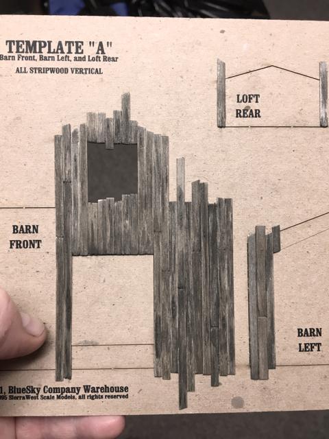 This is an image of the partially complete front wall of the Main Barn for my BlueSky build I'm working on. Note the mottled tones, this is what the final highlighting will accomplish after all the final details are imparted in the boards.