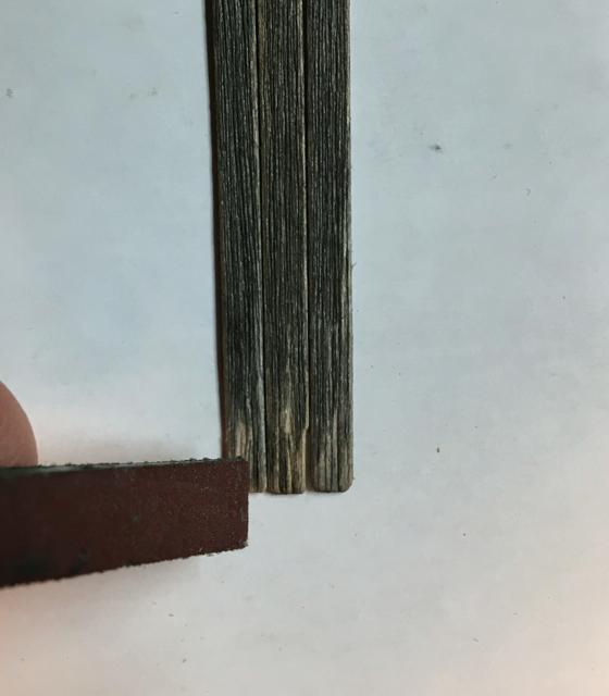 So the following picture shows the board ends with sanding of the previous details that were made. Note the old weathered appearance rather than the fresh cuts and frayed wood. This is so important and will look terrific once the final coloring/highlighting is completed.