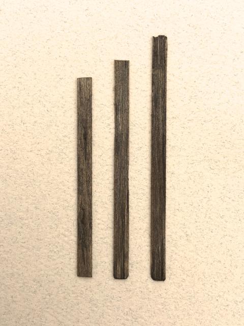 Here is an example of a series of finished boards from my SWSM Loco and Service Shops build. These are individual boards with a faint paint peel. Note the board end detail with the finished staining and color. Once I start my wall I will select specific boards and the ends will be at the bottom of the wall.