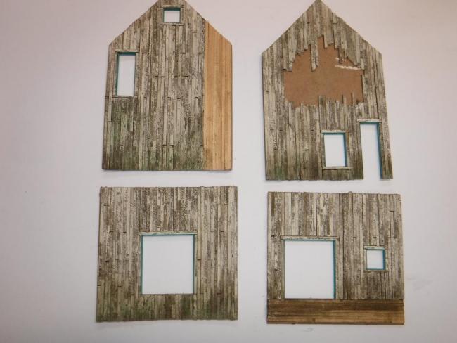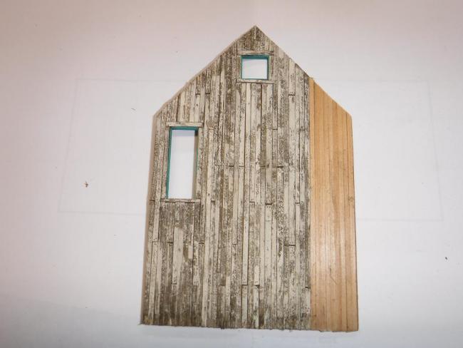 Well....I promised to post pictures...and they will follow shortly. I am building my model for the layout, so since I have no idea yet as to which side will be the "money shot", I will do as Brett intended and fully detail all sides. The shots are progress to this point, there is still a lot of detailing and weathering planned. I also decided that this will be a very active business, so I might go a bit farther on the "dirtying up" of the structure and details. So far, I went with Brett's color scheme as I do like it a lot. And Dr Grunge has also influenced some of the weathering so far. You will notice that I went a little dark closer to the ground on the walls, and in some shots see a hint of green. My layout themes near the water, so dampness does affect the coloring a bit. Nothing is final yet, still playing with the chalks. And I plan to do a bit more distressing of the boards. I want the look of a well used, occassionaly maintained business, so expect a bit of dirt here and there. I am also going to have a few more boards out of skew...so bear with me....any and all advice is welcomed....so...Here we go....