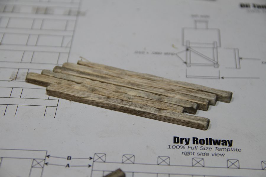 Next up was the Dry Rollway. The huge logs would get dumped off the flat car and onto this structure. Obviously, it would take a lot of abuse. To model that, I heavily grained/distressed the 16x16 timbers and rather than just round off the corners, I beat 'em good! I tried to crush them in a way that would compact the grain of the timbers--much like it would look if a huge tree fell on it. I banged up the corners with the edge of a hammer and polished up the wood with steel wool. In some spots, I gouged the timbers with the handle of an exacto knife. This left a good sized dent and a cool looking black scuff mark (not sure if it's from the steel wool particles getting rubbed by the aluminum knife handle, or what).