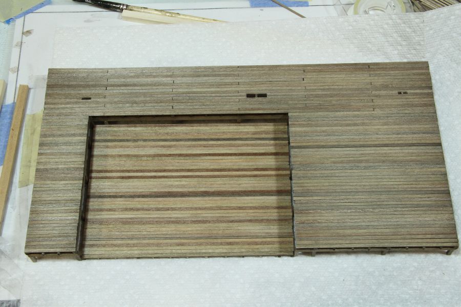 The sub floor is done and I gave it the same treatment as the main floor with the chalk weathering. The colors are nice, but a little too loud. Looked sort of like a gym floor. So again, they got a good brushing with steel wool and a coat of A/I, let it dry and repeat. Here's before and after pics: