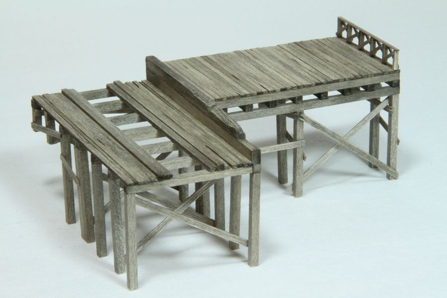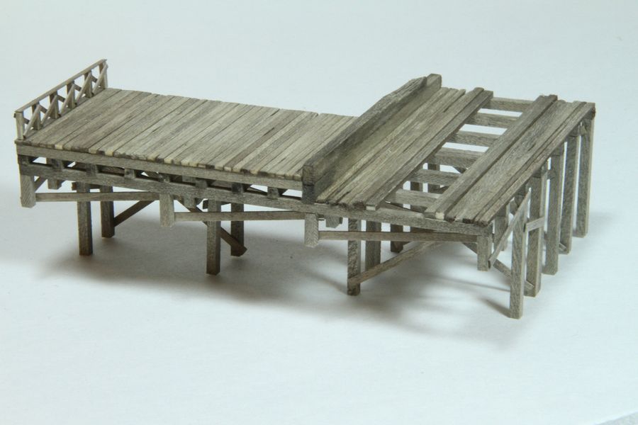 Then it was on to the Old Mill Dock and the Flat Car table. Not difficult to build...just more to it than meets the eye. I tried to make the wood look sun-bleached and fairly beat up. The manual even makes reference to a "run away log" taking out one of the timbers on the side of the flat car table.
