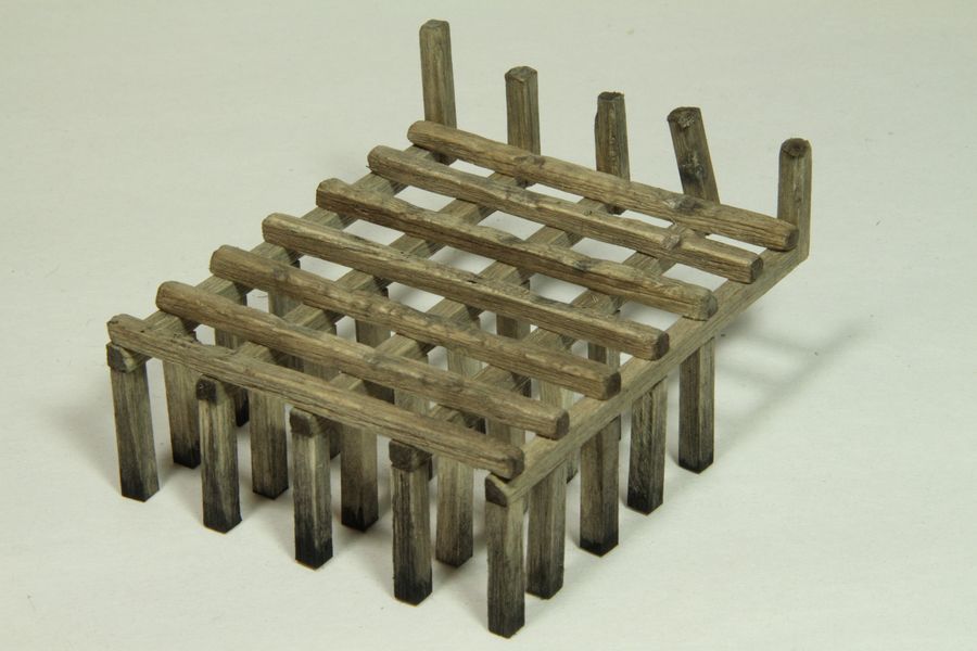For the legs, I wanted to simulate the water-logged look you sometimes see on boat piers. After giving them a deep scribing with an awl and attaching them to bottom, I flipped the whole thing over and dripped A/I onto the bottoms of the legs. Then dabbed on a paste of black chalk and alcohol: