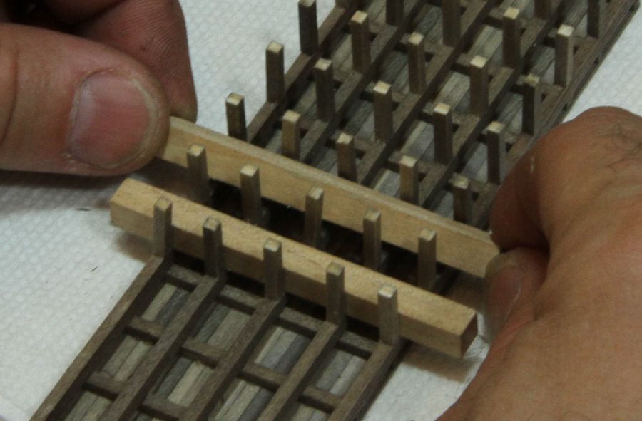 This worked pretty good...better than trying to "eyeball" it with the lines below. To lay the decking, I used popsicle sticks to elevate the guides a little. That made them just tall enough so that the decking could butt right up to them: