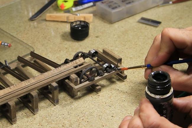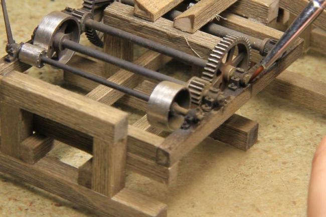 The log haul machinery is unbelievable! (In fact, the same can be said for ALL the castings and machines in the kit). The level of detail is stunning and I wanted to take full advantage of all of it. I mentioned in my Deer Creek mine build that I was experimenting with mineral spirits and chalk (rather than alcohol and chalk) on some of the metal castings. The mineral spirits can give a softer transition from weathered vs. unweathered areas. I went that route again on the log haul: the sections of the spokes show more rust near the hub as opposed to the areas toward the wheel. It seemed to me that there's a lot of metal-on-metal contact in that area, plus it gives the gears a little contrast and definition.