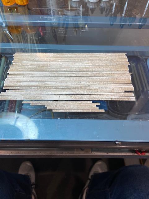 As Brett states on p. 53 of the instruction manual, take your time and carefully select each piece of stripwood to show off all that detail work you did. Here is my front wall before trimming and a detail shot of the wood.