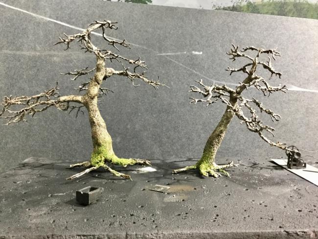 One last update for now. I got the tree trunks painted and I'm liking the way they turned out. The one on the left is a bit spindly at the top, but I think that can be fixed with the foliage. I styled these after an informal upright bonsai as opposed to anything seen in nature as a personal taste. The texture on the bark turned out to be nice. I added foliage to the one that will be on the slope. This is about the orientation that it will be planted. I used Mikroflor mesh style foliage then added some leaves on top for accent. I recently ordered a maple leaf punch and was hoping to make leaves by the hundreds. My package came but that part was not in it. Ugh.IMG_0025