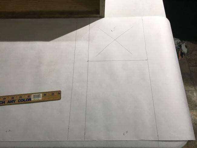 Pic 3 I used some paper to cut a template for the backdrop. Notice the double line at the right...I drew a line where I thought it needed to be for the corner. Then thought that I needed to add 2 inches for the trim...hence the second line. The whole thing ended up 2 inches too long. That's why we practice (;