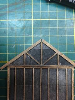 Here are two more pictures. The first is the siding on the right wall of the truck repair. Of course I need to add the battens and the gable end. I did all of it with the ends of wood that I accidently broke while I was wiping off the chalk.