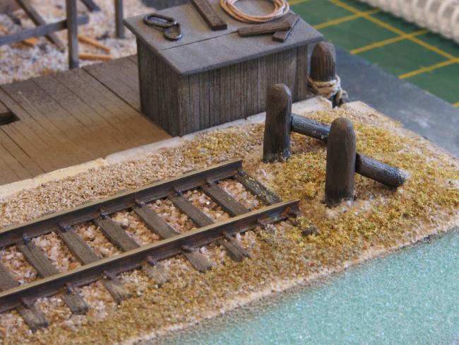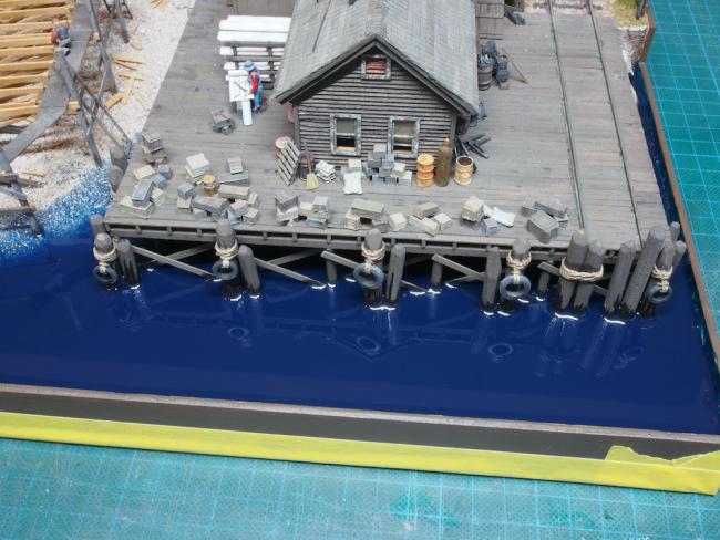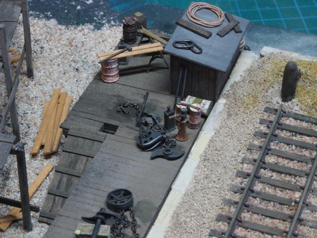 The end of the dock, with the shed and the Derrick both in place. The Derrick has since been removed for safe keeping until the diorama is complete.