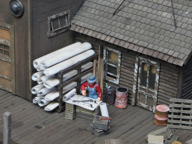 Next we move onto the area outside the Yard Master’s Office. I obtained a set of HO Scale figures from Woodland Scenics and have used some of these to add some more life to the diorama. The set of figures I bought was a Carpenter’s Crew. Here I have modified one (by cutting the saw off of his hand) to represent the Yard Master examining the ship’s plans.