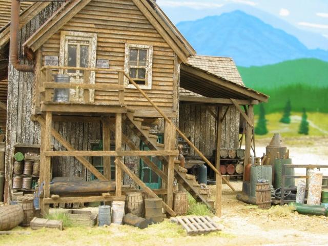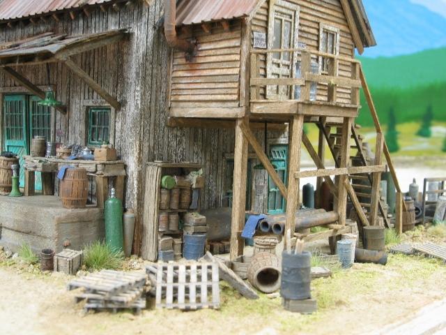 I darkened the stairs and the awning support to match the welding shop platform. I don't think the supports are so dark that they look out of place next to the main building. I also added a little more scenery to this side of the model.
