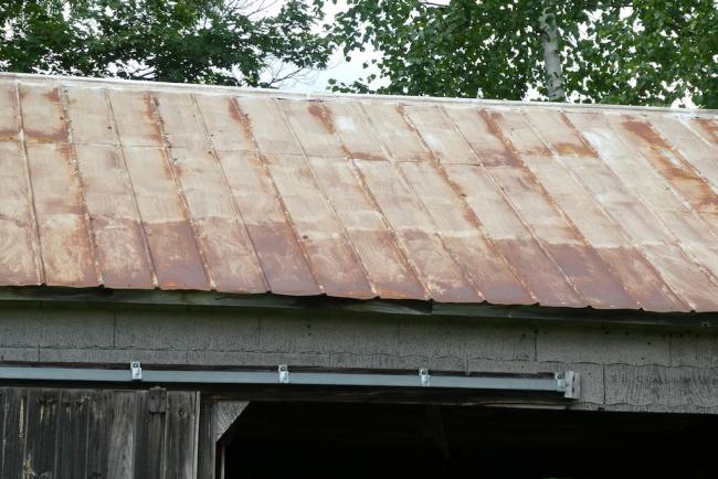 • Within a few hundred yards of these buildings is an old factory that's listed for sale. Pretty standard looking old factory, but I was struck by the skylights on the roof. I count at least three different repair jobs and materials on these windows. Notice also the requisite shrubbery that's growing up there.