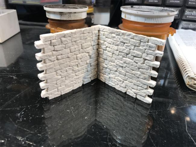 These new ones are only about 3.5"x3.5", for this new wall I cast individual stones and then built the wall stone by stone. I designed and built the corners on these new walls so that they will interlock with themselves from side to side meaning they can be combined continuously in any combination and to any length, including inside corner and outside corner with a clean fit as shown in my previous post. The interlocking is universal with itself, which was tricky to design and achieve.