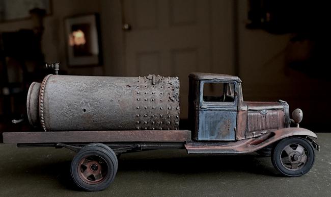 My friend Lee T. figured her out. She spreads used oil on the dusty dirt backroads around Penobscot Falls! Now, what details besides straping down the tank with turnbuckles and bent rod would make her more real? And wood support underneath, and lots of oil over the ass end.
