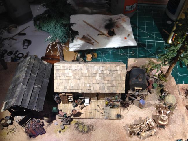 I've been putting finishing touches on these two structures and surrounding "junke" for a few days after having a far too busy November. Each building is on a relatively small 1 inch thick pink foamboard and fits puzzle like into the layout.